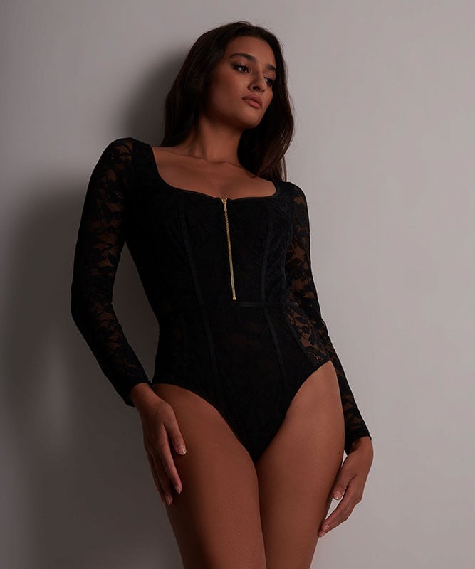 ソフトで着心地がよく、スタイリッシュなフローラルレースで覆われた長袖タイプのボディは、美しいスクエアネックにジップがセクシーなアクセント。首の後ろから背中まで大胆に素肌を見せます。モダンで少し冒険的な印象。